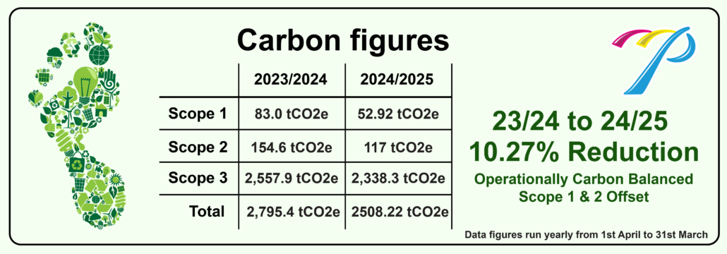 We are proud to partner with CarbonQuota, experts in packaging, print, and carbon management, to enhance transparency within our carbon footprint reporting. Now, every quote and job we produce includes carbon data, allowing our customers to make informed, sustainable choices. We can also suggest lower-impact alternatives and demonstrate the carbon savings these options provide. Additionally, we can provide detailed reports on the carbon impact of your projects over a chosen time period.